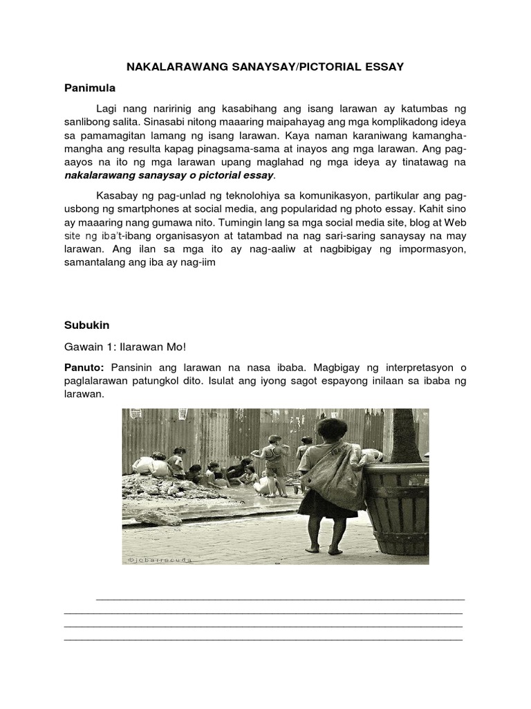 Halimbawa ng larawang sanaysay. Larawang Sanaysay Bilang Akademikong Sulatin. Ano ang pangunahing layunin ng larawang sanaysay. Ito ang pinakamalupit at talamak na dahilan ng paghihirap ng.