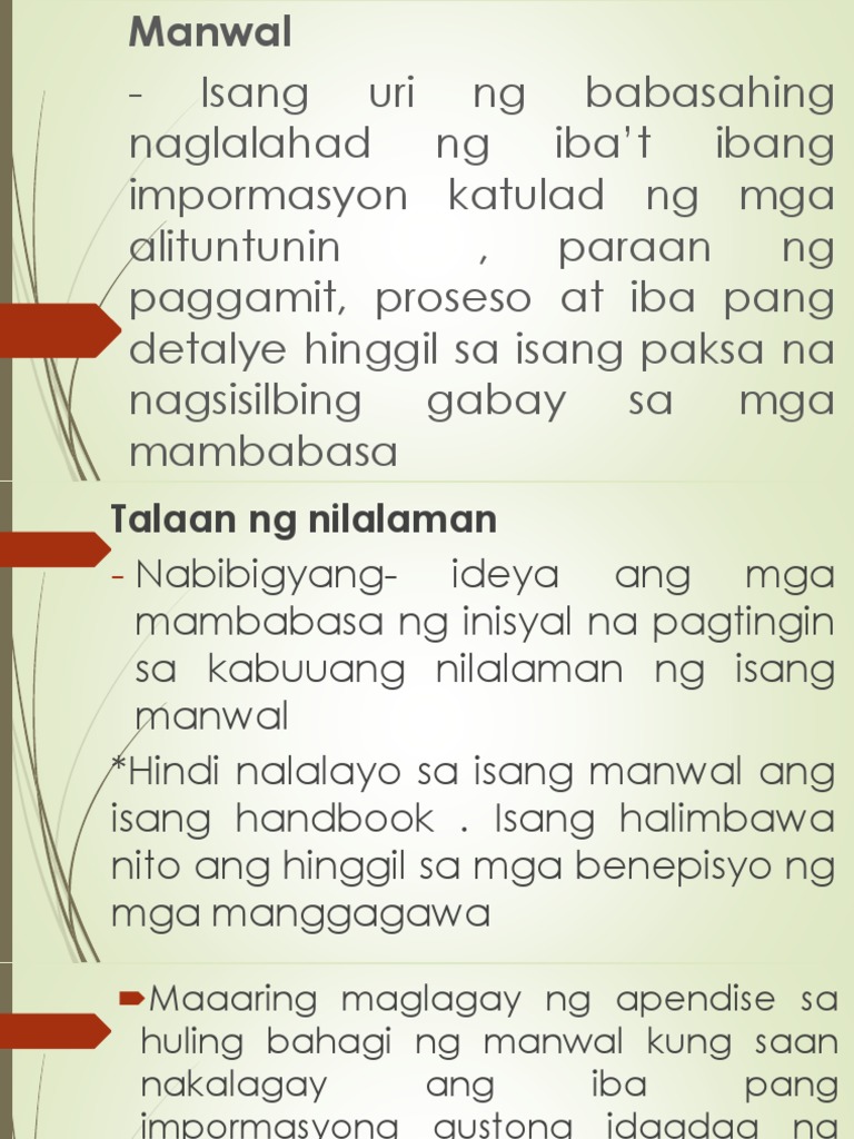 Paano magluto ng fried chicken 4. Talaan ng nilalaman-nakasaad dito ang pagkakahati-hati ng mga paksa sa loob ng manwal at ang pahina kung saan ito tinatalakay 4. Manwal dahil naglalayon itong magpaliwanag at maglahad ng mga impormasyon tungkol sa isang bagay o paksa.