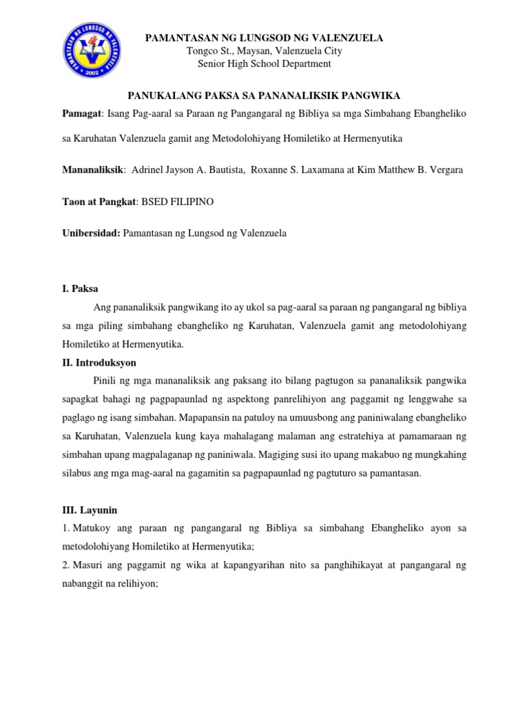 Halimbawa Ng Panukalang Paksa Sa Pananaliksik Pangwika Core3 Plv Pdf