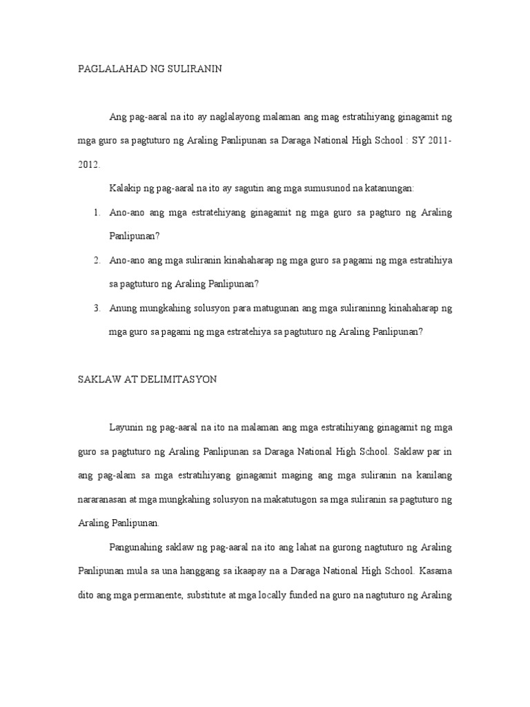 Paglalahad ng suliranin halimbawa. PAGLALAHAD NG SULIRANIN Sa pangkalahatan ang pag aaral ay tungkol sa natatanging kultura ng Palawan. Layunin Sa bahaging layunin makikita ang mga bagay na gustong makamit o pinaka-. 37 Full PDFs related to this paper.