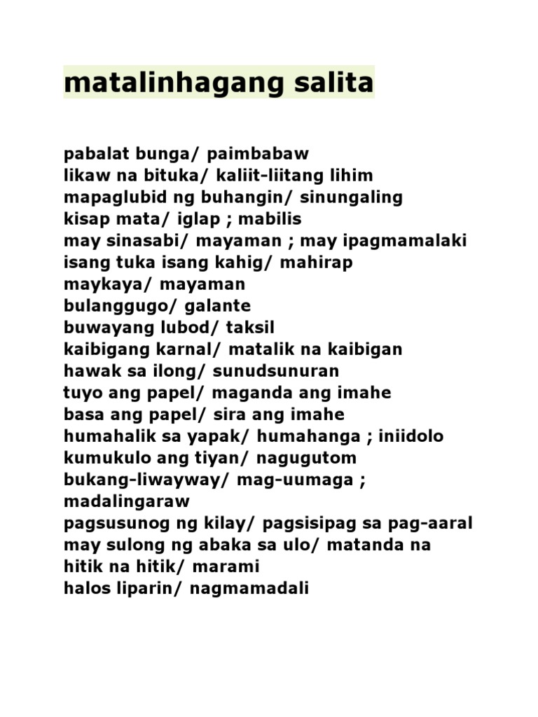 100 matalinhagang salita a. May sinasabi - mayaman. Luha ng buwaya Hindi totoo ang pag-iyak.