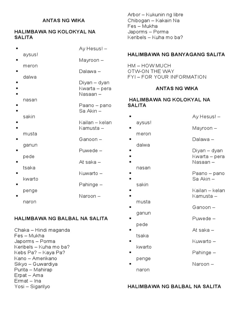 1112017 Halimbawa. Wikang Filipino pangalagaan kolokyal at balbal ay iwasan. Ditse Ate 2Sangko Kuya 3Pasanin problema 4Talukbong pandong 5Bahay balay 10.