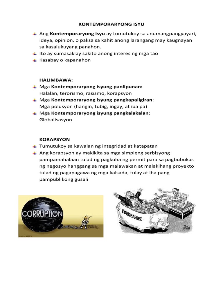 Ano ang Kontemporaryong Isyu. 20 Questions Show answers. Maituturing ang isyung ito na pribadong bagay na nararapat solusyunan sa pribadong paraan.