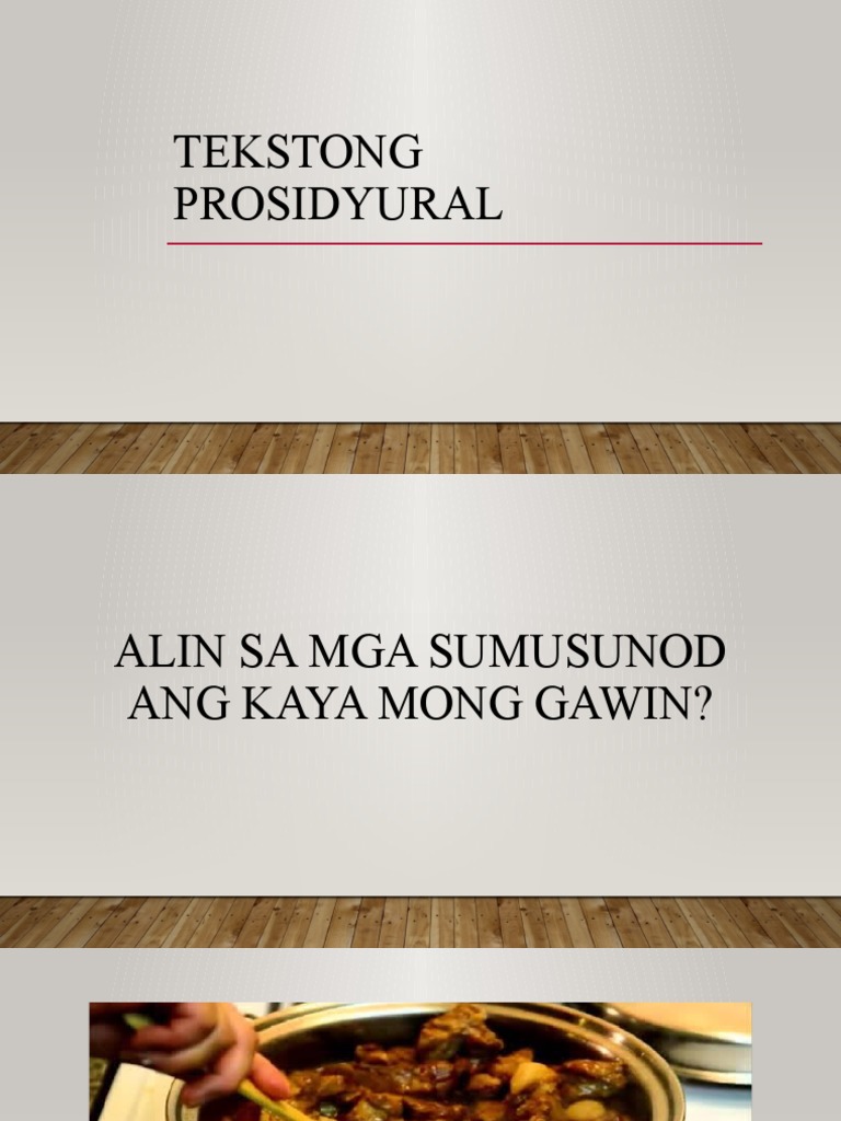 Pagluluto ng pagkain 2. Layunin nitong maipabatid ang mga wastong hakbang na dapat isagawa. Ang tekstong prosidyural ay nagbibigay ng kaalaman para sa maayos na pagkakasunod-sunod ng isang gawain.