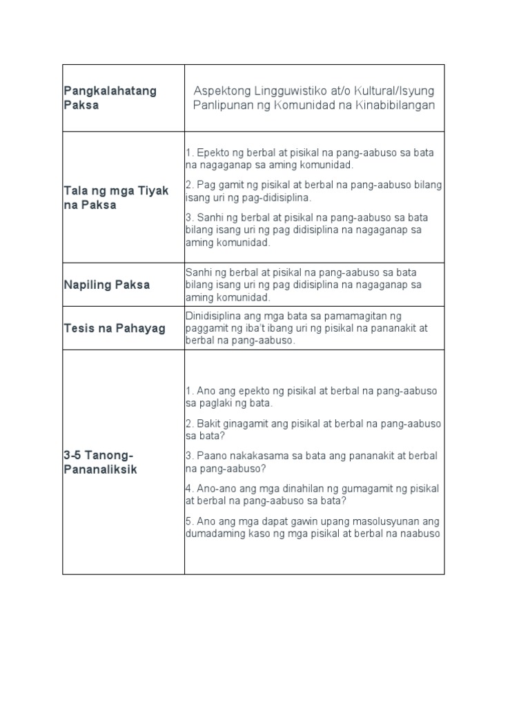 Kung sakaling wala kang magustuhan sa mga paksang ibinigay upang pagpilian ay maaari mong kausapin ang iyong guro upang mabigyan ka ng. Pag gamit ng pisikal at berbal na pang-aabuso bilang Tala ng mga Tiyak isang uri ng pag-didisiplina. Uri ng pangungusap na walang paksa.