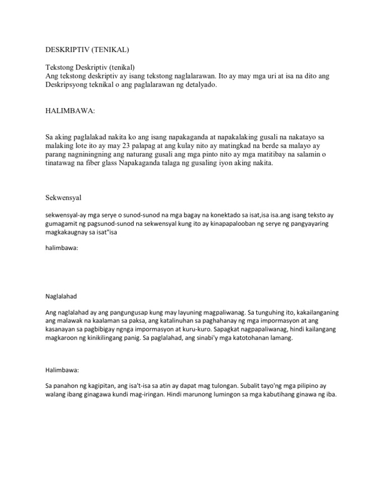 Muling isulat ang iyong teksto taglay ang anumang pagwawasto. View Tekstong DeskriptiboVisayasdocx from NURS 001 at San Jose State University. Samantala ang talatang naglalahad ay paraan ng pakikipagtalastasang pasulat o pasalita na naglalayong magpaliwanag.