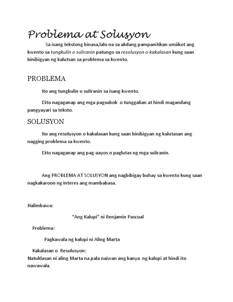 Kulang sa pondo para pananaliksik upang mapaganda ang mga teknolohiya sa pagsasaka. Sa isang tekstong binasalalo na sa akdang pampanitikan umiikot ang kwento sa tungkulin o suliranin patungo sa resolusyon o kakalasan kung saan binibigyan ng kalutsan sa problema sa kwento. Mga halimbawa ng paghahambing at pagkokontrast.