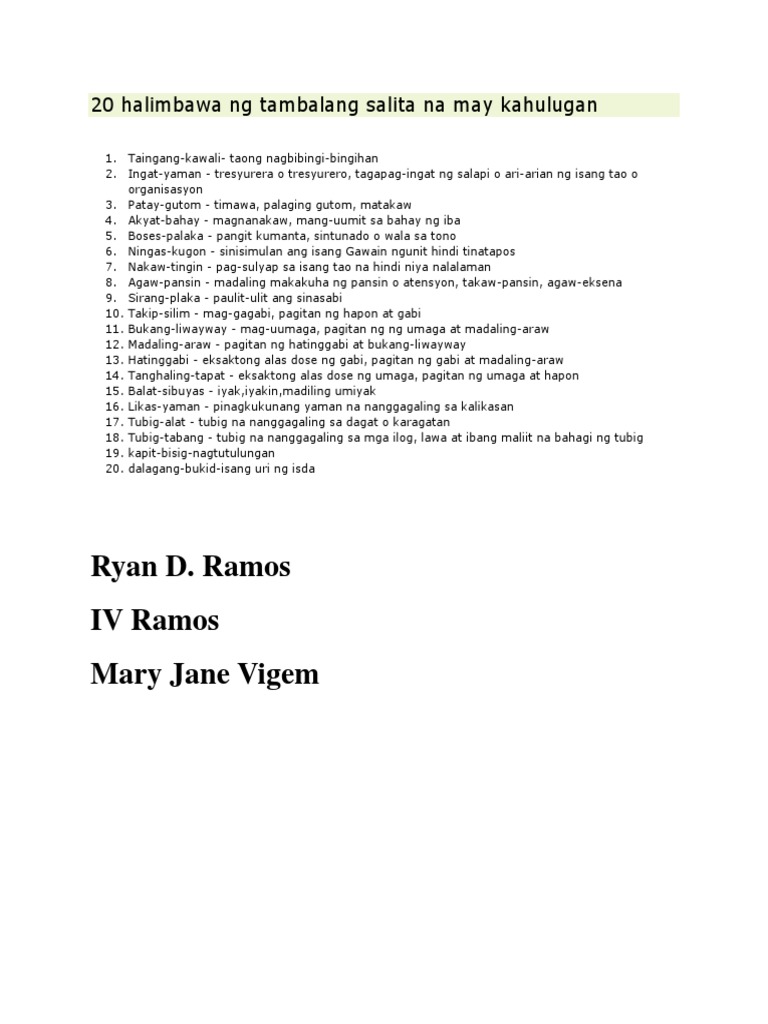 20 Halimbawa Ng Tambalang Salita Na May Kahulugan Pdf
