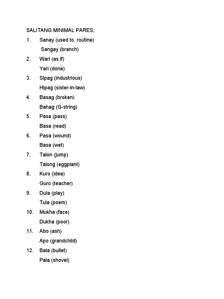 1tila-dila 7usa-oso 8upo-opo 9damas 2iwan-ewan 10paso-baso 3pala-bala 11puro-puno 4patas-batas 12tela-tila 5mesa-misa 6. PARES-MINIMAL pares na salita na magkaiba ng kahulugan ngunit magkatulad na magkatulad sa bigkas maliban sa isang ponema sa magkatulad na pusisyon.